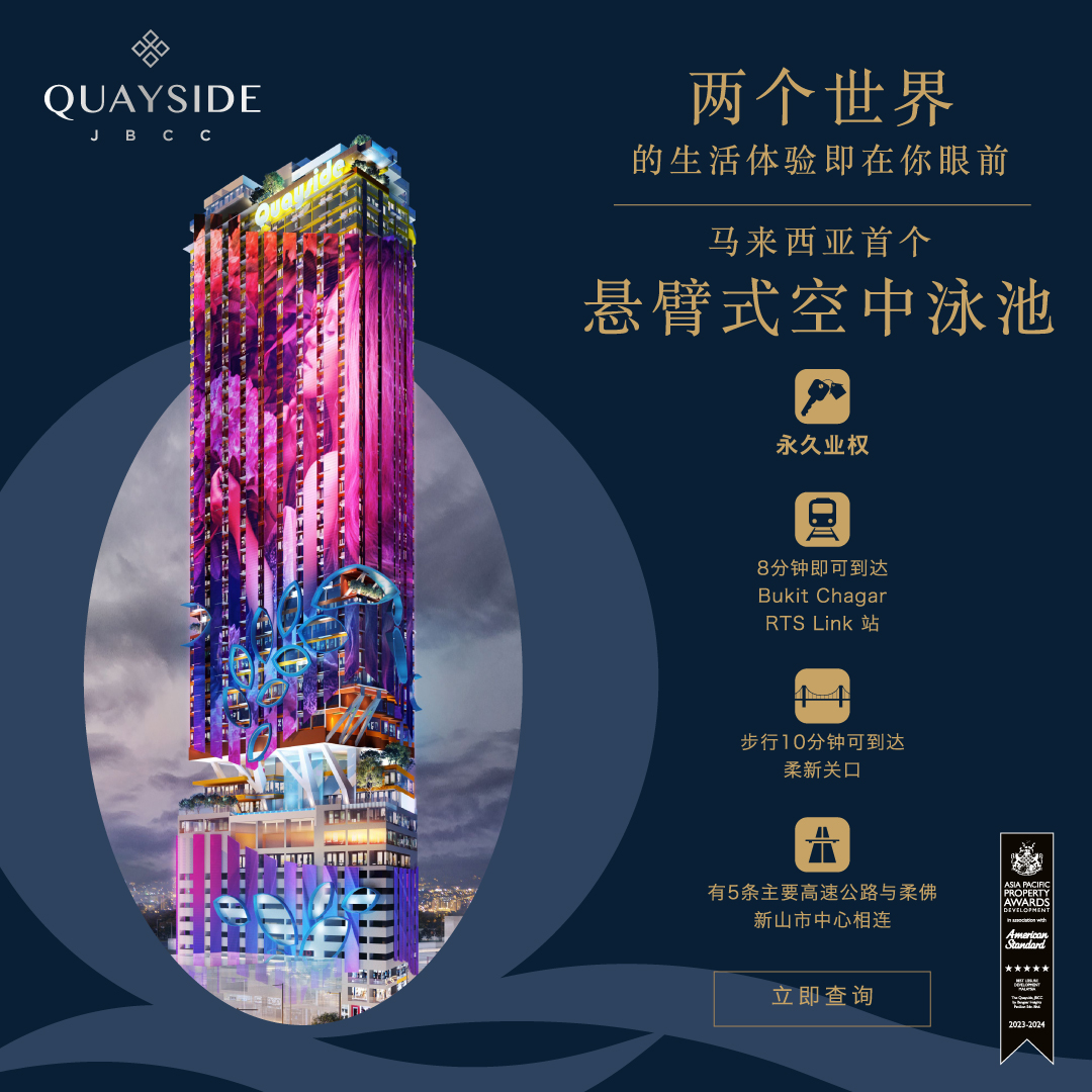 位于柔佛新山市中心的 Quayside JBCC,拥有无与伦比,令人惊叹的新加坡天际线美景,地理位置绝佳。在这里,您将享受到城市的活力、绝对的便利、艺术、文化和令人满意的购物体验。精致、高品质的设计套房,将让您的非凡生活提升至新层次。