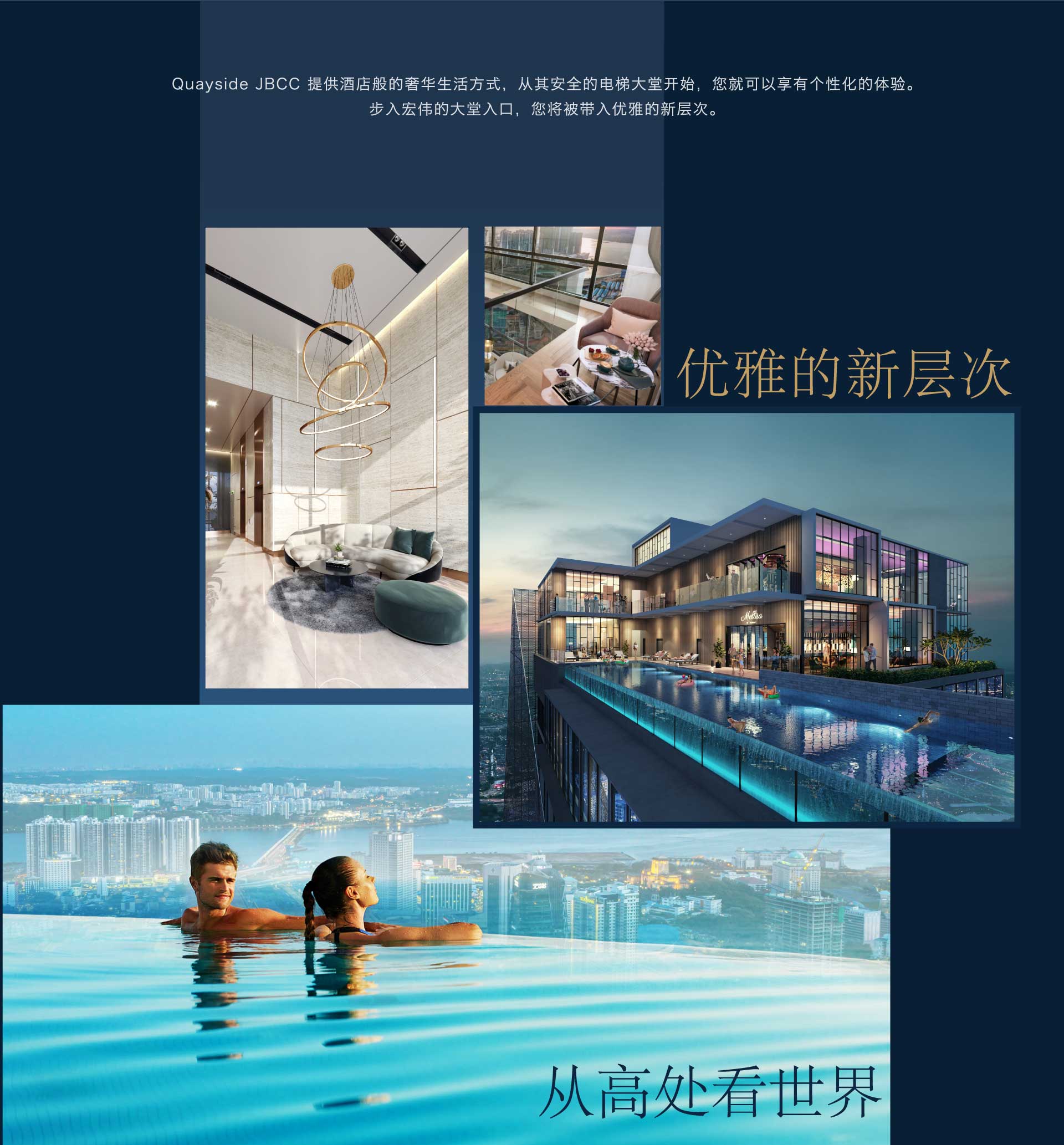 位于柔佛新山市中心的 Quayside JBCC,拥有无与伦比,令人惊叹的新加坡天际线美景,地理位置绝佳。在这里,您将享受到城市的活力、绝对的便利、艺术、文化和令人满意的购物体验。精致、高品质的设计套房,将让您的非凡生活提升至新层次。