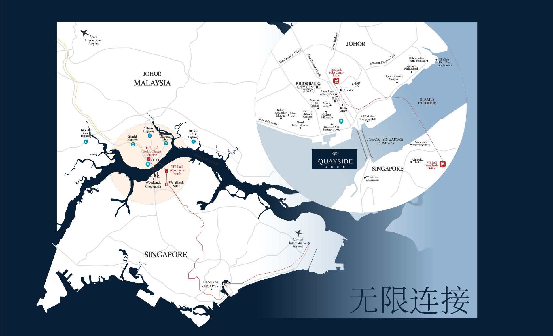 Quayside JBCC 位于柔佛新山市中心和新加坡之间,提供了一个享受两全其美的独特机会。 它在最抢手的位置引入了全新的奢华体验,距离即将到来的柔佛新山 – 新加坡捷运系统(RTS)仅几步之遥,实现了便利的城市生活方式和便捷的交通。